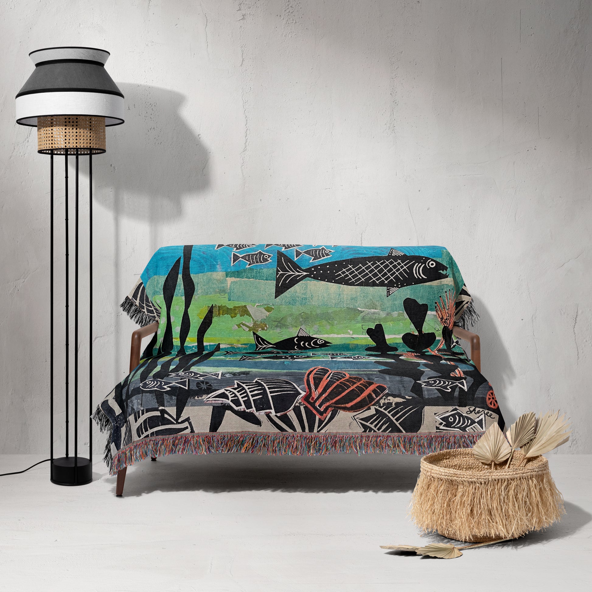 Our "By the Sea" Sailing-Ocean-Undersea-Life themed collage is a playful nod to all things seaside. Imagine yourself in a sailboat gently floating in a calm sea while flying and swimming things travel above and below. This custom woven (not printed) blanket will warm you on chilly nights and add a bit of color and charm to any beach house decor. Made of 100% pure cotton that is dyed in 6 subtle colors, it's easy care and can go from the sofa to the sandy beach - just toss it in the machine when needed.