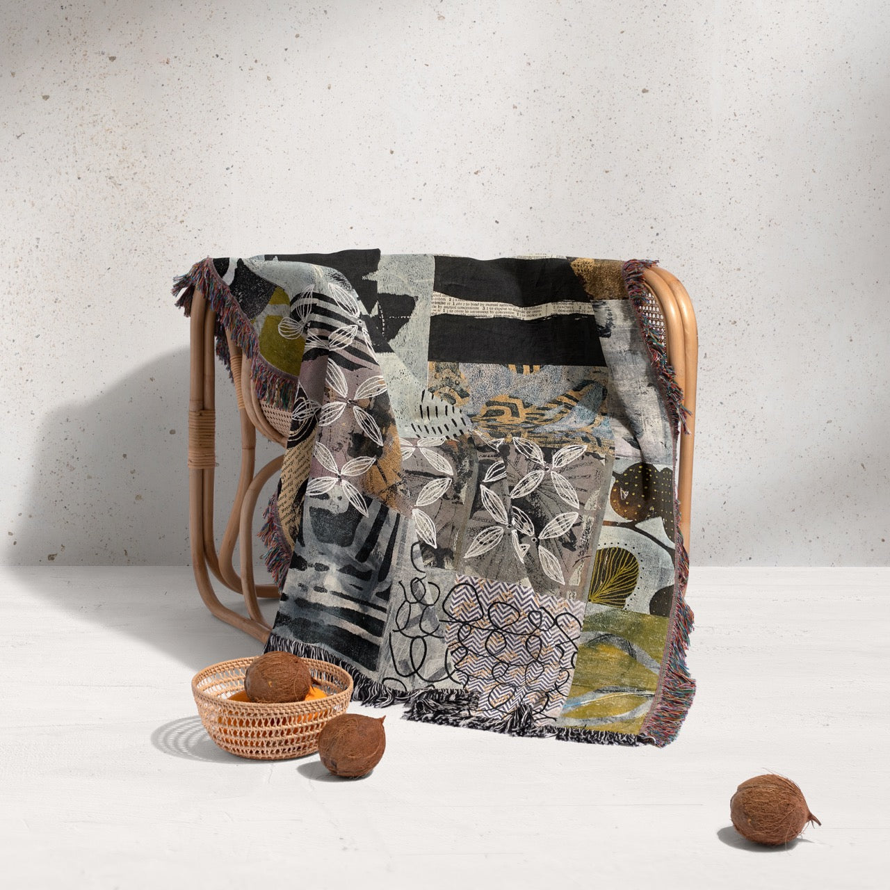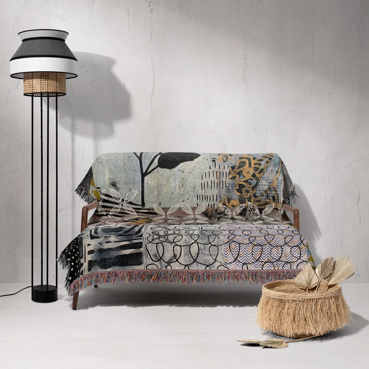 Comfortable and versatile, our 100% organic and recycled cotton woven blanket features "Overcast", an original botanical collage. Subtle neutral colors combine with distinctive shapes to create a work of art that works as a wall decoration, a throw for your sofa, or even a picnic or beach blanket. This soft, easy-care woven blanket will warm you on chilly nights and bring a sense of style to any room in your home.