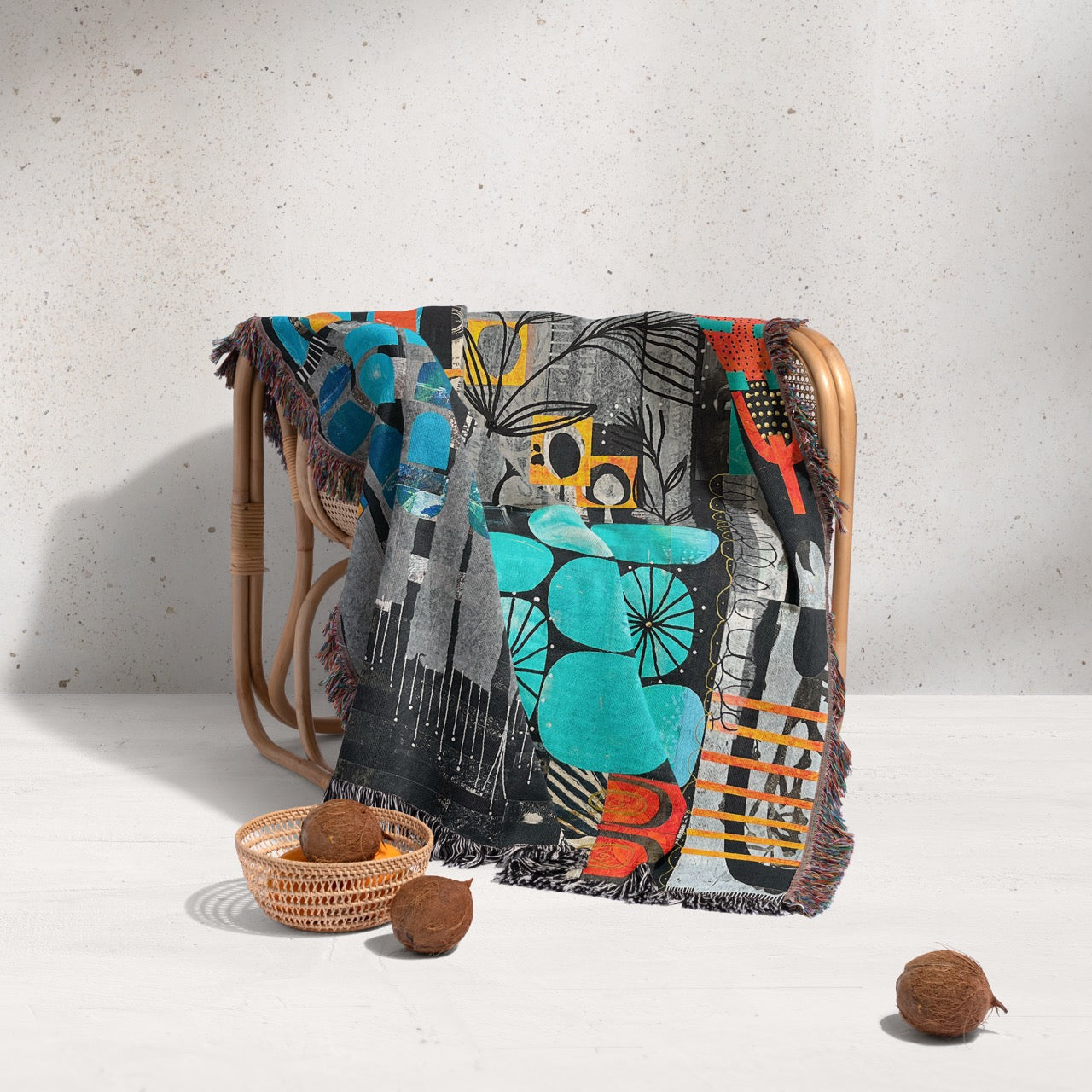Lover of color? We've got you covered (wink) with this "Rainy Monday" Jacquard woven blanket. Teal, orange, and yellow hand-cut shaped over a textured field of gray - a lovely combination. Custom woven from 100% pure cotton, it's comfortable, easy care, and oh-so versatile. Use it as a wall decoration, a throw for your sofa or chair, or even a picnic or beach blanket. Toss it in the machine when it needs freshening. It warms you when it's chilly and brings a splash of color and texture to any room in the house.
