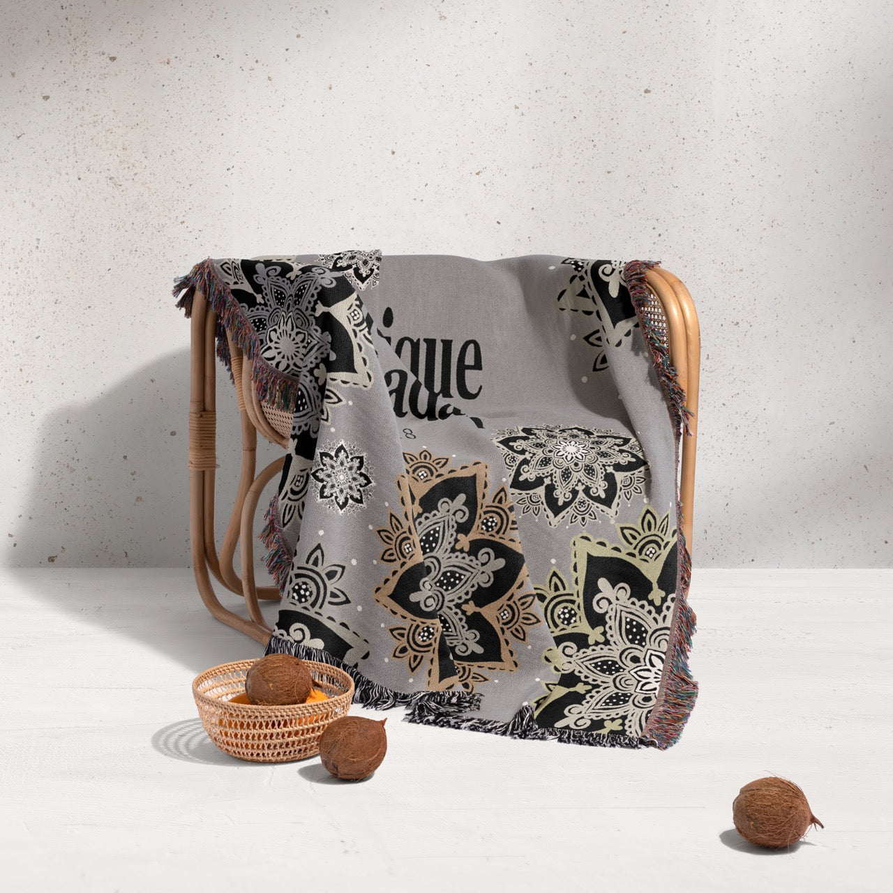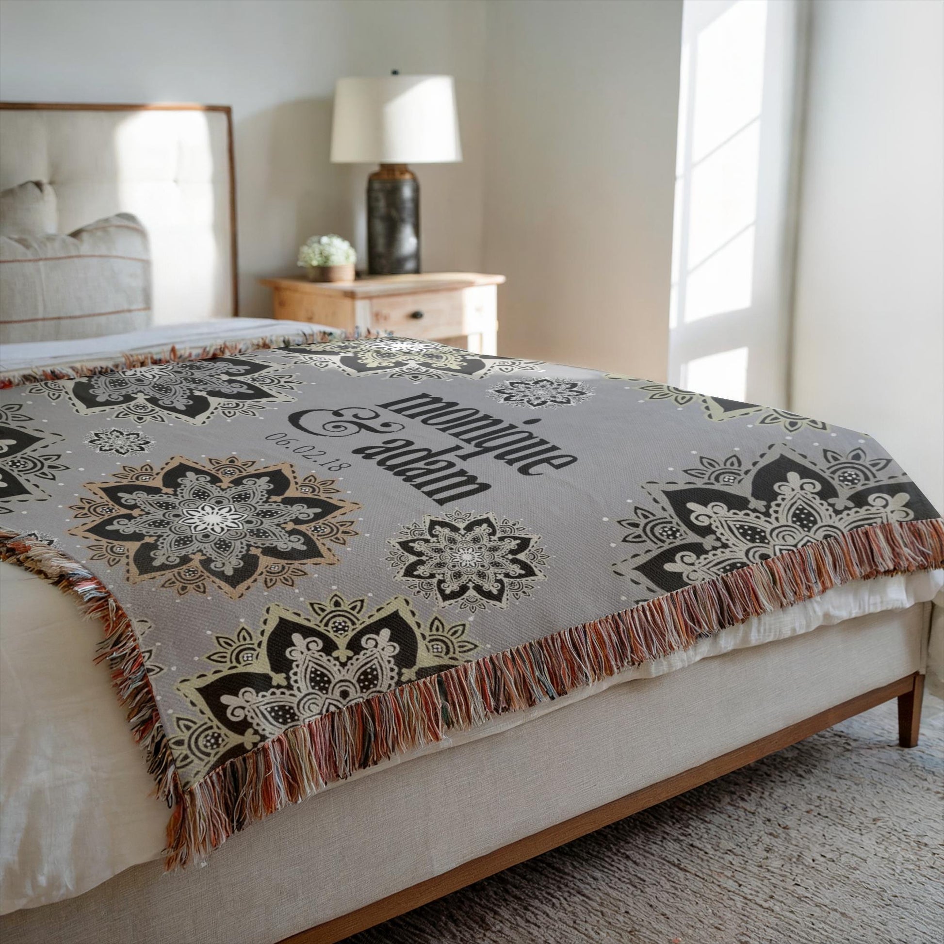 This lovely wedding-themed woven blanket is personalized with two names and a special date rendered in a black hand-carved lower case font over a neutral grey background. Your names are surrounded by hand-sketched mandalas in muted colors of grey, sage, cinnamon, black, and cream. Soft and warm, it becomes art when draped over a couch, across the bed, or even hung on the wall.